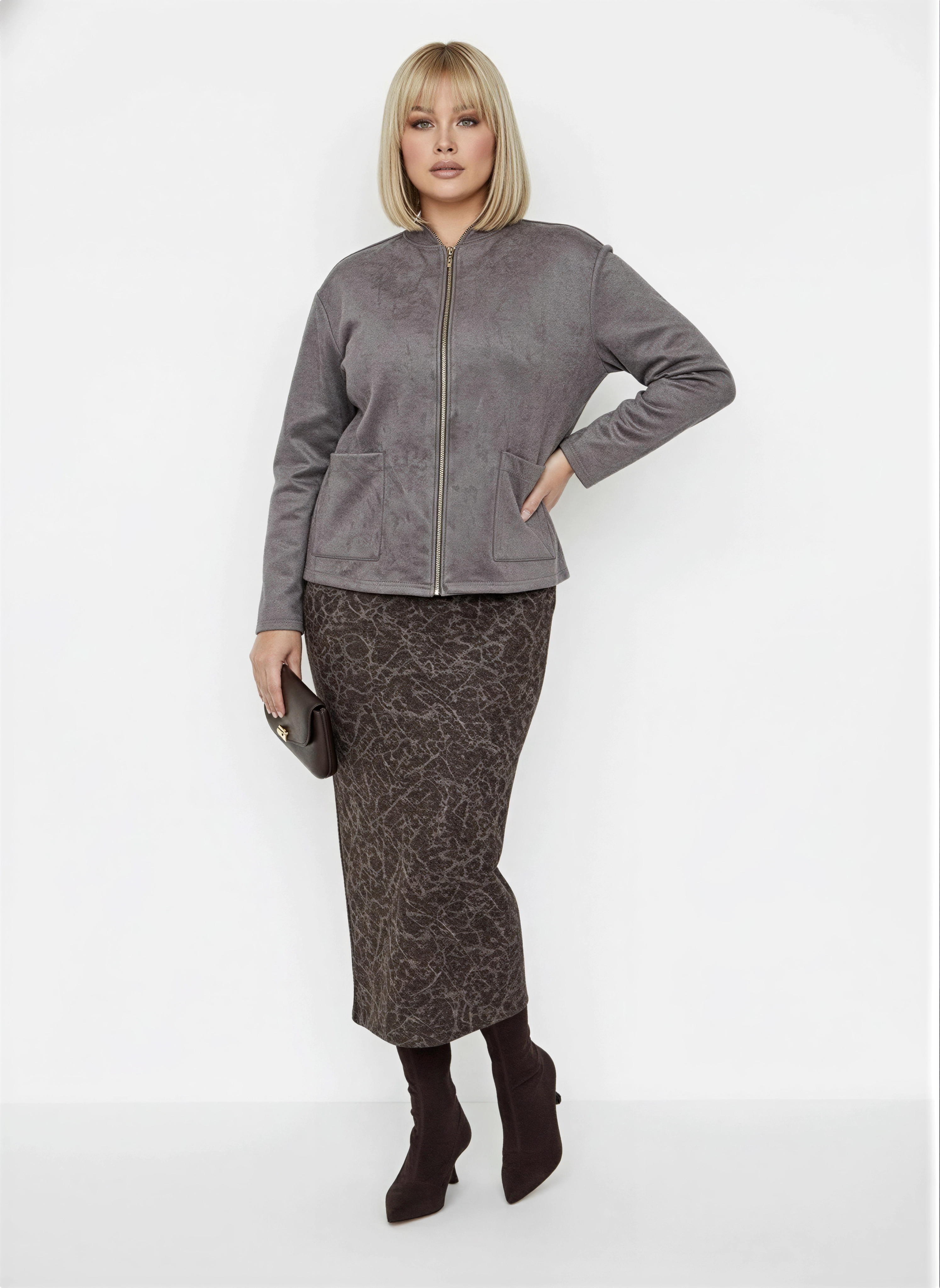Жакет прямого силуэта выполнен из замши. Круглый вырез горловины, длинные рукава с чёткой линией плеча. Застёжка на молнию по центру переда, спереди расположены накладные карманы. Длина изделия — до линии бедер. Модель без дополнительного декора, с аккуратной обработкой швов, подчёркивающей лаконичный и современный характер изделия.